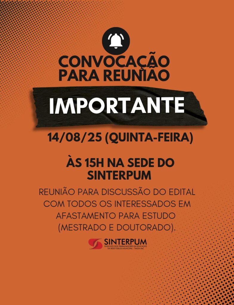 O Sinterpum convida todos os servidores interessados em discutir o edital para afastamento para estudo, nas modalidades mestrado e doutorado, a participarem de uma reunião no dia 14 de agosto, às 15h, na sede do sindicato.