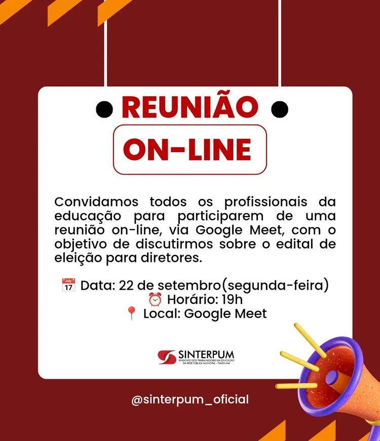 Convidamos todos os profissionais da educação para participarem de uma reunião on-line, via Google Meet, com o objetivo de discutirmos sobre o edital de eleição para diretores.