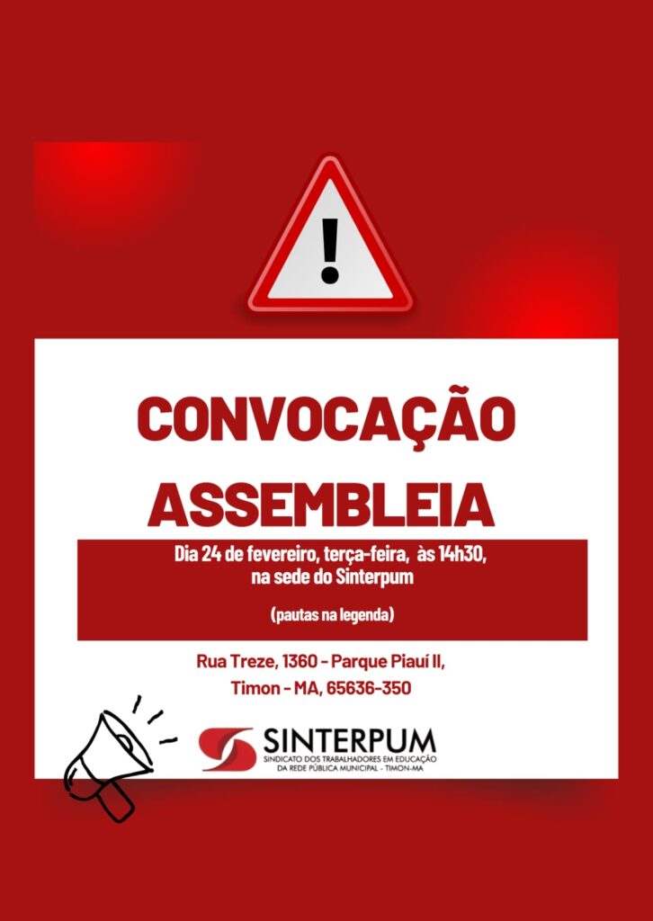 O SINTERPUM – Sindicato dos Trabalhadores em Educação da Rede Pública Municipal de Timon-MA, por meio de sua Diretoria Executiva, atendendo ao que dispõe o Estatuto, convoca todos os profissionais da educação para participarem da Assembleia Geral Extraordinária, a ser realizada no dia 24 de fevereiro de 2026, às 14h30, em primeira convocação, e às 15h, em segunda convocação, com qualquer número de sócios presentes, na sede do sindicato, localizada na Rua Treze, nº 1360, Bairro Parque Piauí, Timon – MA, com a seguinte pauta: