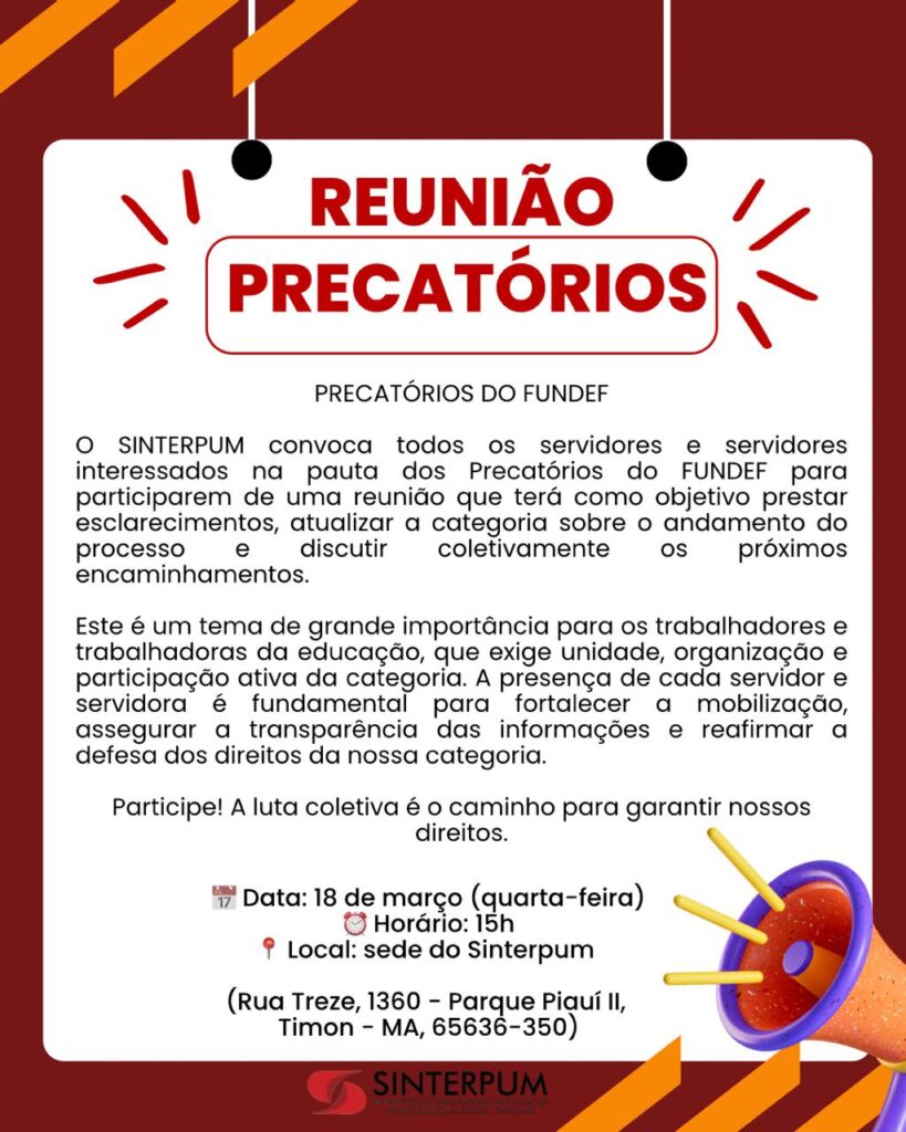 O SINTERPUM convoca todos os servidores e servidores interessados na pauta dos Precatórios do FUNDEF para participarem de uma reunião que terá como objetivo prestar esclarecimentos, atualizar a categoria sobre o andamento do processo e discutir coletivamente os próximos encaminhamentos.