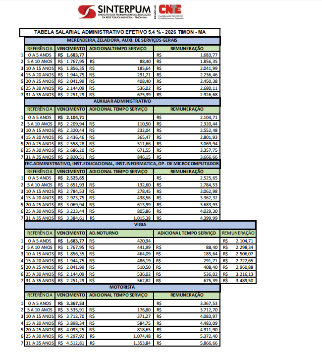 TABELA SALARIAL – ADMINISTRATIVO – 2026