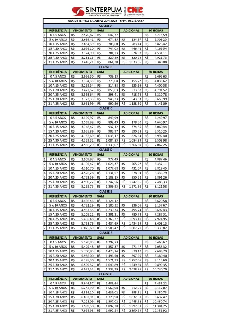 TABELA SALARIAL 20H – 2026