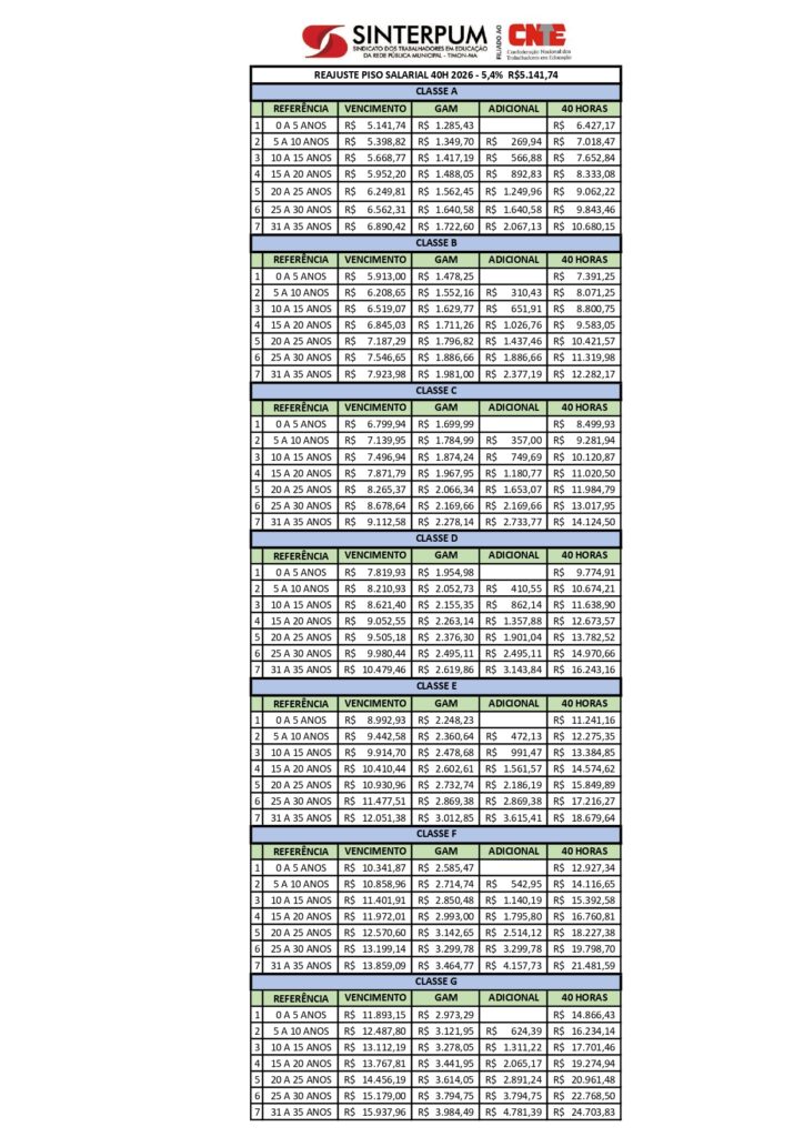 TABELA SALARIAL 40H – 2026